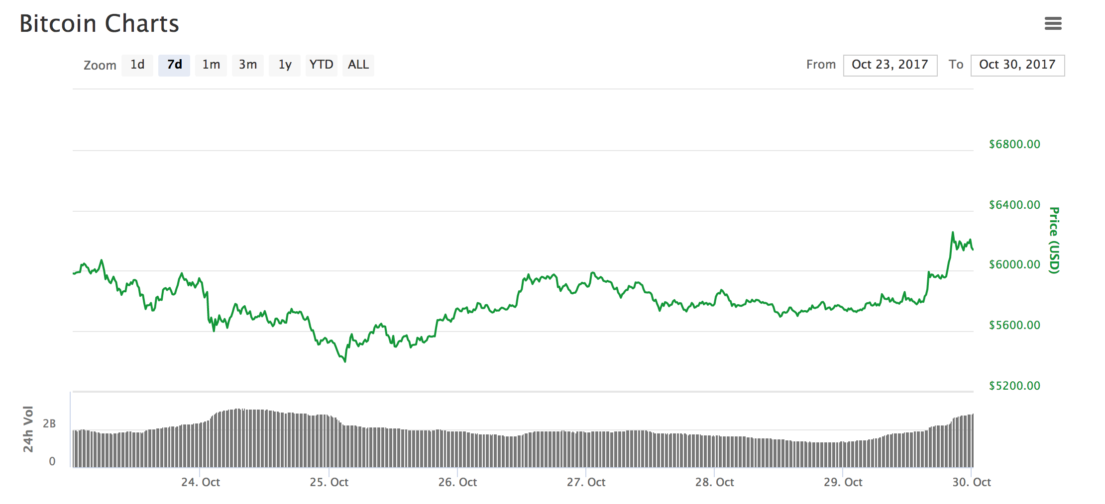 ราคาของ Bitcoin หรือเหรียญคริปโตที่มีชื่อเสียงโด่งดังมากที่สุดในโลกตอนนี้ได้พุ่งทะลุ 6,300 ดอลลาร์ไปแล้วในช่วงคืนที่ผ่านมา และมีมูลค่าตลาดรวมอยู่ที่ 102.2 พันล้านดอลลาร์ ซึ่งคิดเป็นประมาณ 57.4% ของส่วนแบ่งตลาดทั้งหมด ทั้งนี้ เหตุการณ์ดังกล่าวมีขึ้นท่ามกลางข่าวลือที่ว่าประเทศจีนอาจจะกลับมาอนุญาตให้เว็บเทรดต่างๆในประเทศกลับมาเปิดให้บริการอีกครั้ง